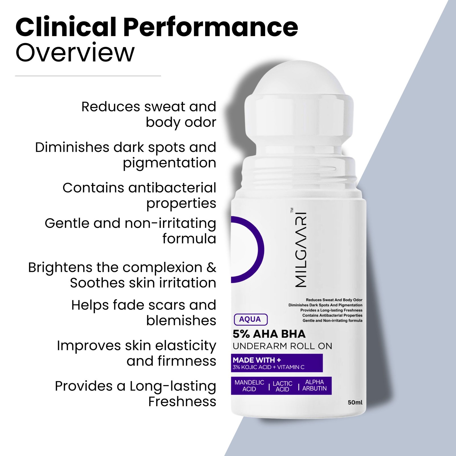- SAFE & EFFECTIVE: Formulated by dermatologists, the 5% AHA BHA underarm roll-on features clean and effective ingredients that are free from harmful compounds such as parabens, sulfates, alcohol, and silicones. Our products are cruelty-free, ensuring a safe testing process overall.